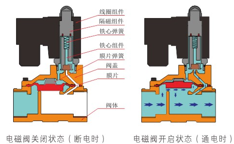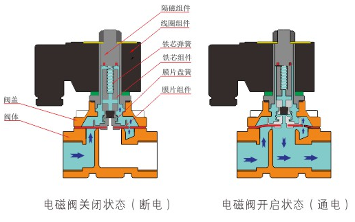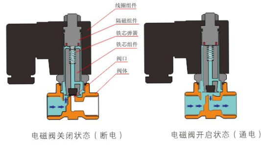 原理:开云手机站官方端网站登录入口-开云(中国)直动式电磁阀分常闭型和常开型两种。常闭型电磁阀断电时为关闭状态,线圈通电时产生电磁力,动铁芯跟静铁芯吸合,电磁阀阀口打开,介质(流体)通过;当电磁阀线圈断电时电磁阀消失,在弹簧的作用力下,电磁阀动铁芯复位,阀口关闭,介质(流体)不同,电磁阀呈关闭状态。常开型与之相反。